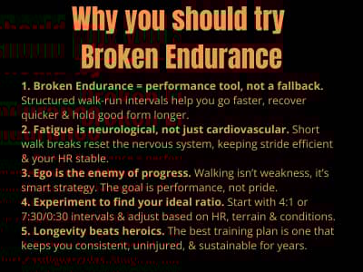 At its heart, Broken Endurance is the deliberate use of structured walk-run intervals to boost performance, improve recovery, and maintain technique for longer.