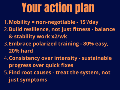 Training smart means building mobility before you need it. It means creating resilience alongside fitness. It means understanding that easy days make hard days possible, and that consistency trumps intensity every time. Most importantly, it means treating your body as the integrated system it is, not a collection of parts to be fixed when they break.